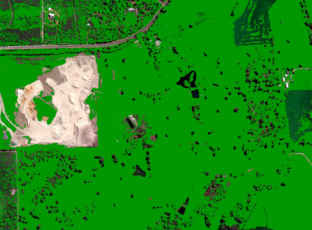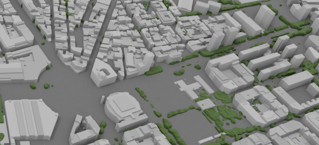 - Vegetation is masked or excluded where buildings overlap, so any tree or plant canopy intersecting a building footprint is trimmed at the building boundary.